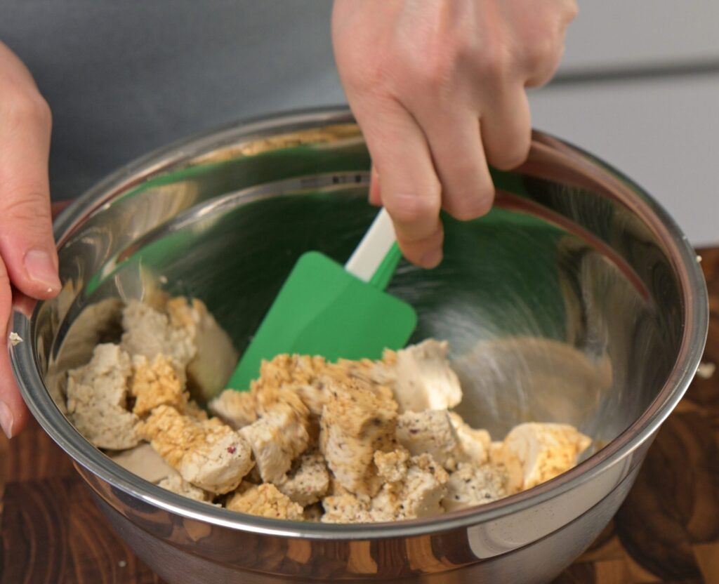 - Prep the tofu – Remove excess moisture from tofu: press with a towel and weight for 20–30 min / boil in salted water for 10 min / freeze-thaw and squeeze. Break into medium chunks, toss with soy sauce and pepper, then coat lightly in lentil flour.