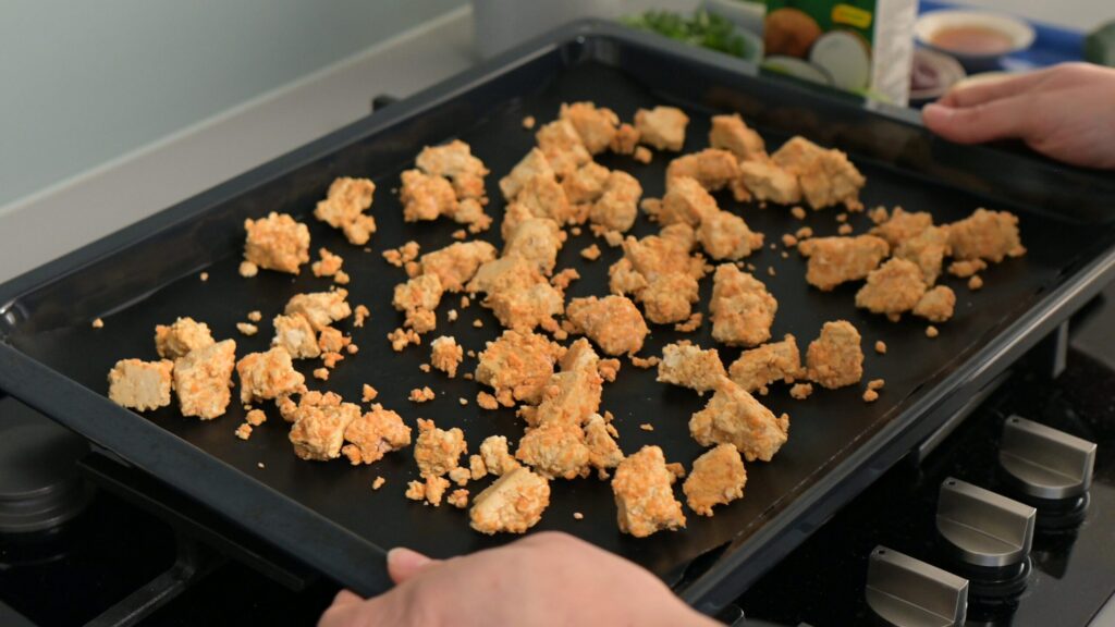 - Bake the tofu – Spread on a lined tray and bake for 20 minutes, stirring halfway. It should be sligolden and firm outside, soft inside. The goal is for the tofu to have a firm outer layer that will hold the sauce and soak up its flavor, while staying soft inside—so don’t over bake.