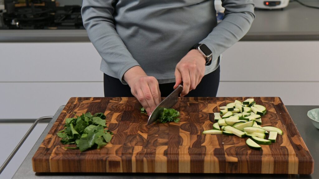 - Prep the veggies – Slice the zucchini lengthwise into thirds, then crosswise into medium but not thick pieces. Roughly chop the parsley and spinach leaves. Grate the zest of two limes and squeeze the juice of three limes.