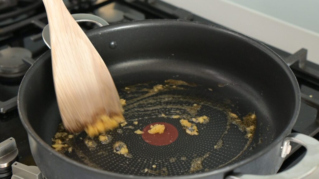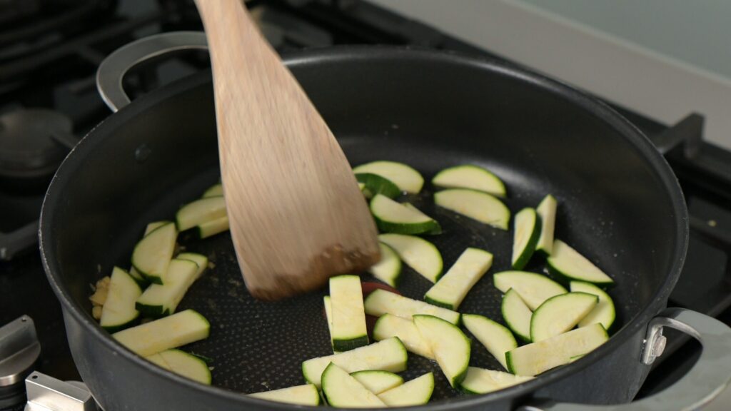 - Start the sauce – Heat sesame oil in a wide pan over medium-high heat. Add ginger and fry briefly (don’t burn), then add zucchini.