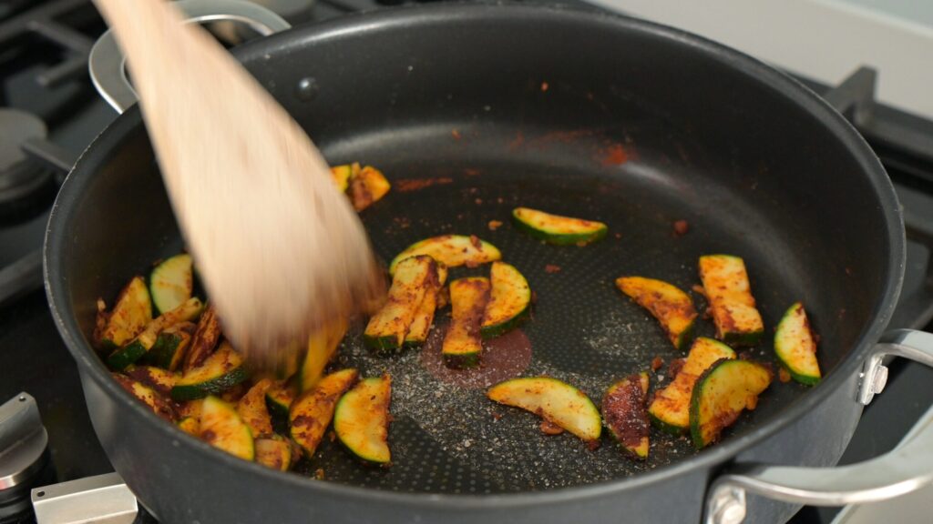 - Add spices – Once zucchini softens and browns, stir in smoked paprika, ras el hanout, and a pinch of salt.
