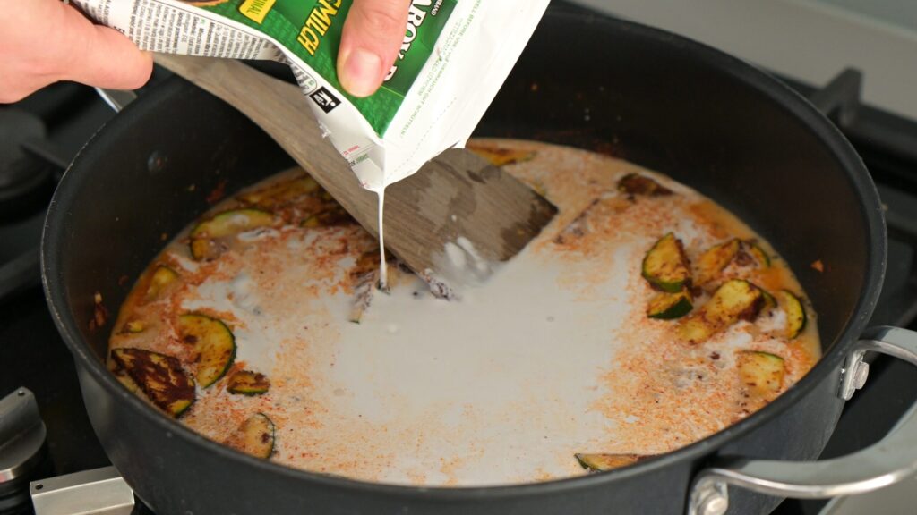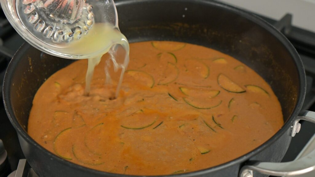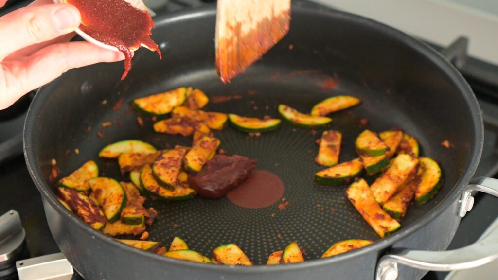 - Make it saucy – Once the zucchini is coated in the spices, add gochujang, shake the coconut milk well, pour it in, then stir in maple syrup and soy sauce. Mix until smooth and cohesive. After that, add lime zest and freshly squeezed lime juice. Stir well.