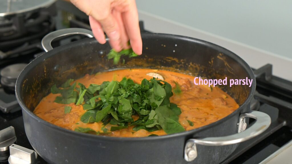 - Finish with greens – Reduce heat, add spinach and parsley, and cook for one minute.