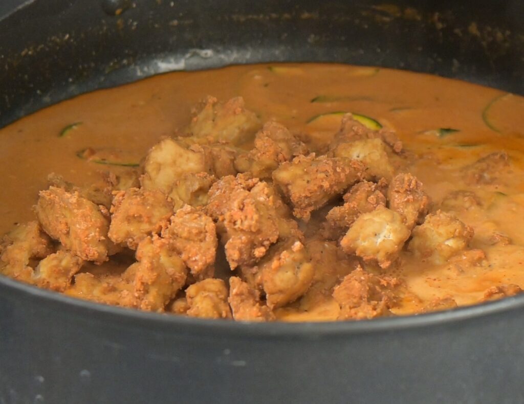 - Simmer with tofu – Add the baked tofu to the pan and let it gently simmer in the sauce for 5-10 minutes, stirring every minute, allowing it to soak up the flavors.