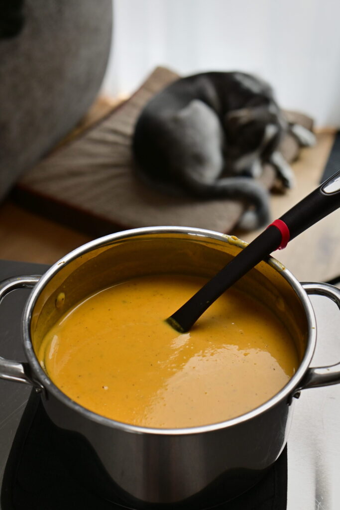 This orange soup completely surprised me — in the best way. The base is rich, silky, and packed with warm flavor, but it’s the addition of white beans that really takes it to another level. They make the soup so much heartier and more satisfying, adding a subtle creaminess without any heaviness. The balance of sweet, savory, and earthy notes is spot-on 😉